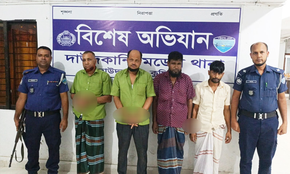 আটকরা হলেন নারায়ণগঞ্জ জেলার সোনারগাঁ উপজেলার রতনপুর এলাকার মো. কালাম, কুমিল্লা জেলার তিতাস উপজেলার কলাকান্দির রাজা মিয়ার ছেলে কবির হোসেন, দাউদকান্দি উপজেলার কলাকোপা এলাকার হানু মিয়ার ছেলে কবির (২৬) এবং মুরাদনগর উপজেলার আব্দুস সালামের ছেলে রাজিব ওরফে তারা মিয়া।
